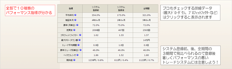 投資の上級者であれば気になる「最大ドローダウン」「プロフィットファクター」などの詳細指標も分かります。